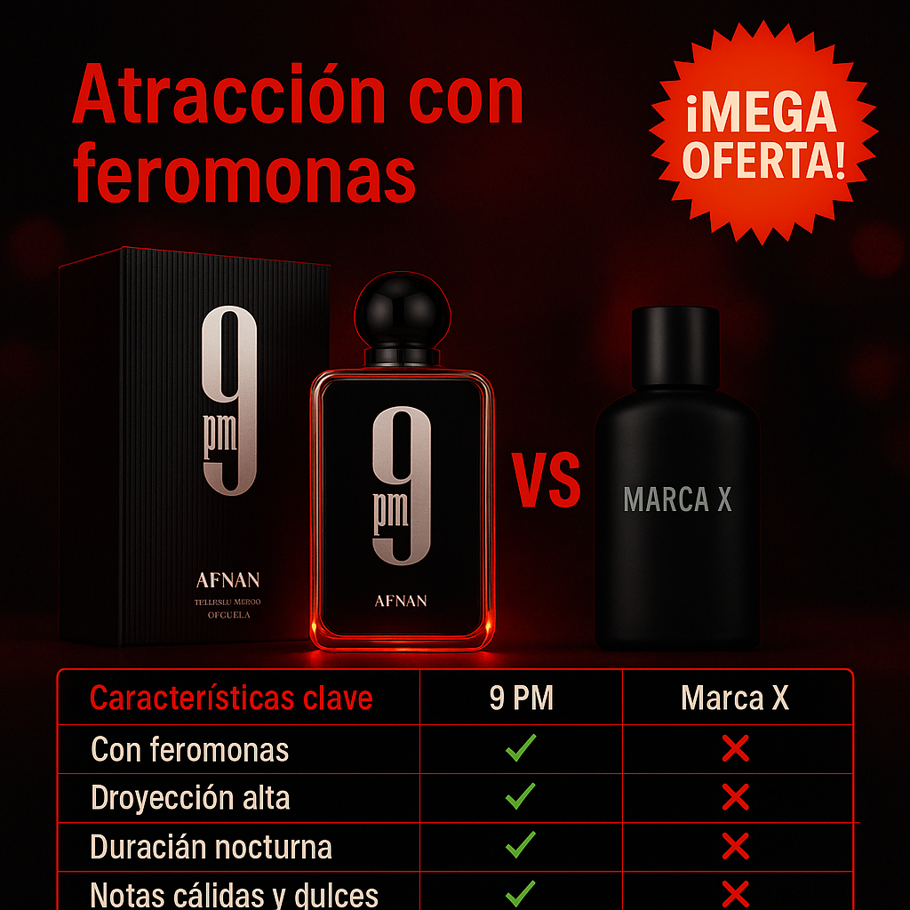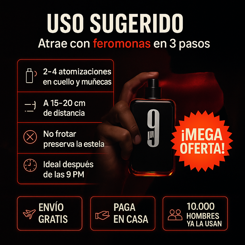 9 PM con feromonas crea una estela cálida y dulce que dispara su atención sin decir una palabra.